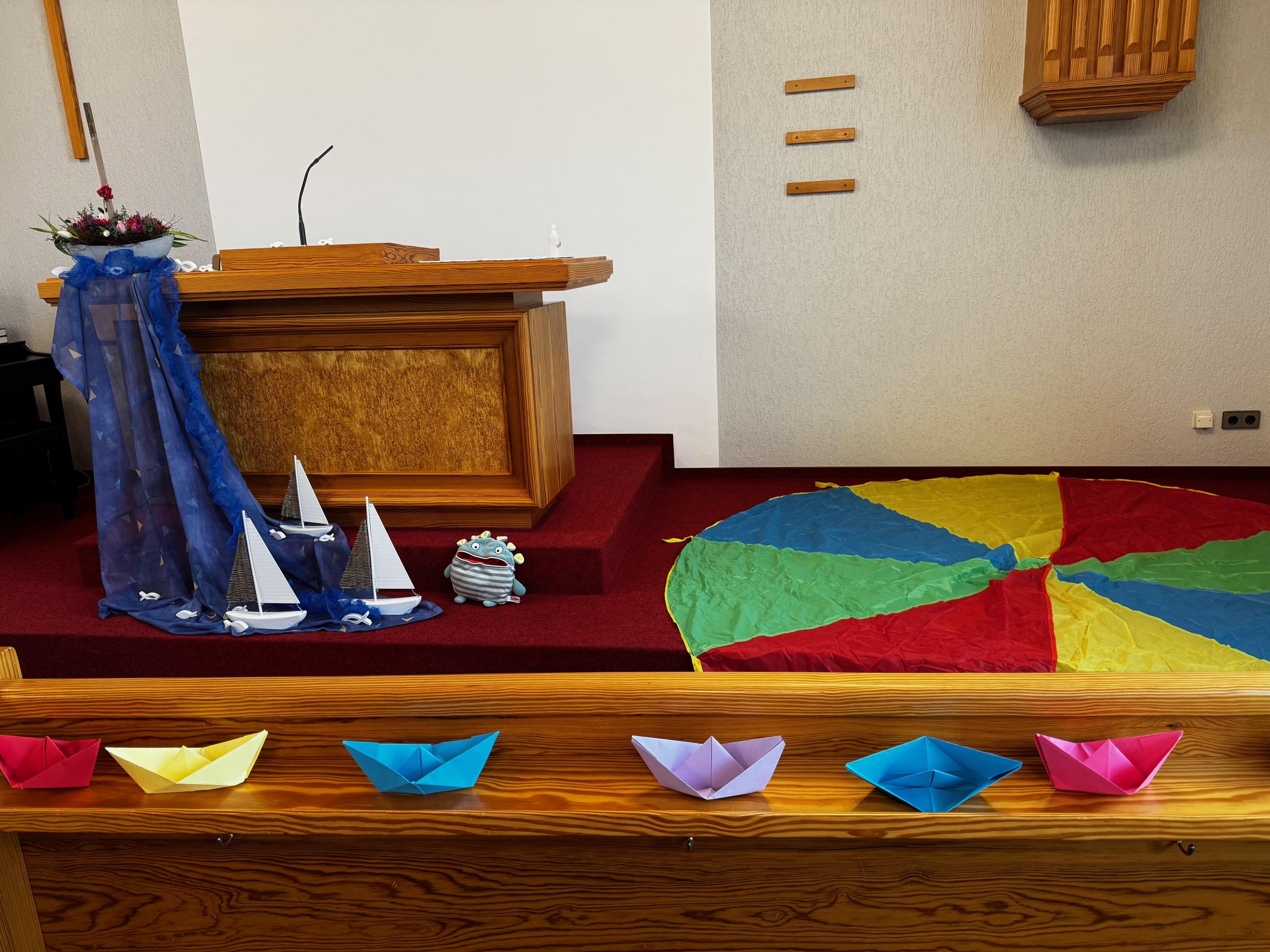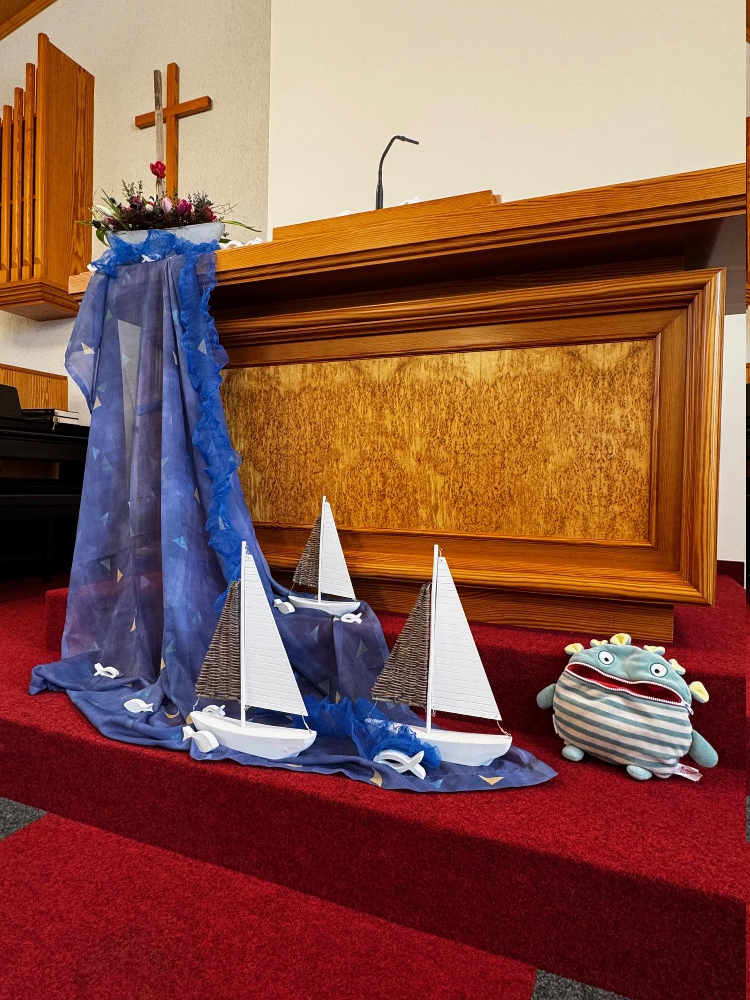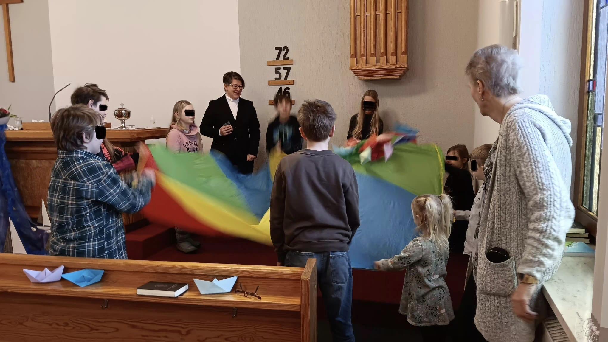 Am 01.02.2026 fand in der Gemeinde Otterndorf ein gemeinsamer Küsten-Kindergottesdienst mit den Gemeinden Cuxhaven, Dorum und Nordholz statt. Trotz der widrigen Witterungsverhältnisse kamen Kinder mit ihren Eltern und Betreuern nach Otterndorf. Das Motto des Gottesdienstes 'Fürchte dich nicht! Jesus stillt den Sturm' passte damit genau. Vor dem Gottesdienst bastelten die Kinder kleine Papierschiffchen aus Papier, die dann im Gottesdienst stark beansprucht wurden. Als ein Teil der Predigt wurden diese auf einem großen Schwungtuch mit Hilfe der Diakonin kräftig durchgeschüttelt. Immer wieder durfte jemand mit dem Wort 'Stopp' den Sturm stillen. Das machte einen großen Eindruck, nicht nur auf die Kinder...